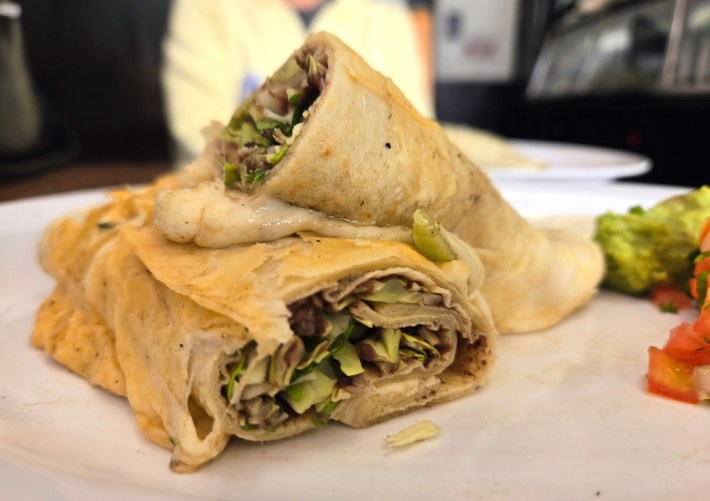 Then you need an introduction to the five-pound, footlong burrito being served at Pomona's longstanding restaurant Juanita's. A flour tortilla big enough to swaddle an infant is prepared in-house, then filled with your choice of chile verde, carne desebrada, carne asada, or chicken. Then comes the cheese, beans, rice, guacamole, lettuce, sour cream, and other expected burrito matter, with an extra inner flour tortilla to secure it all in.